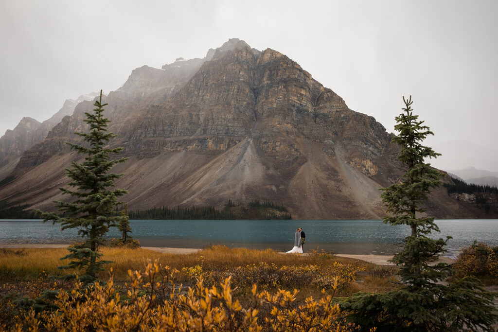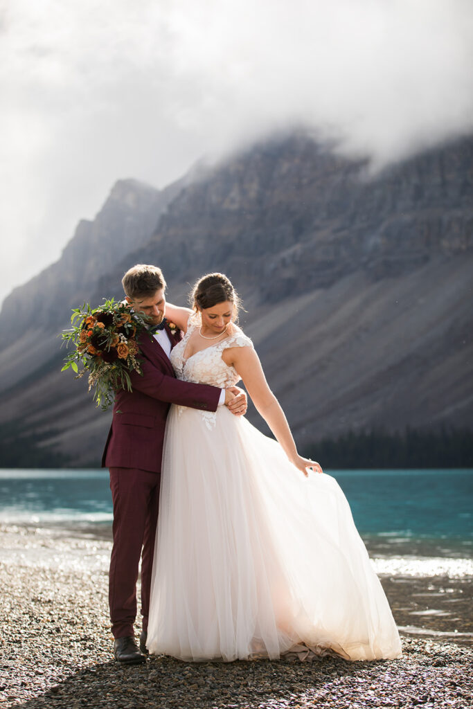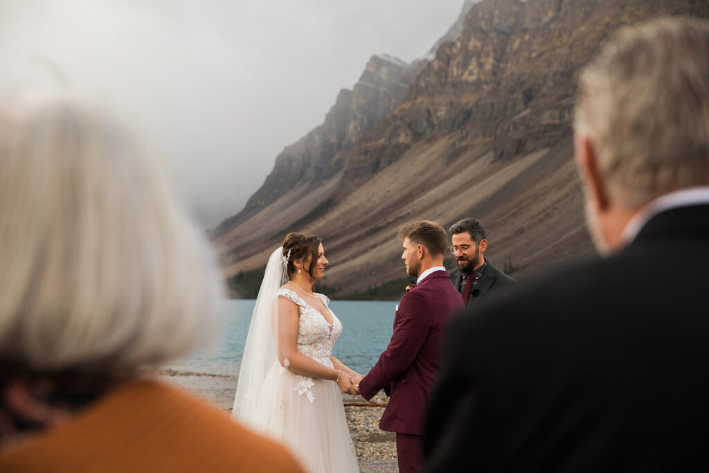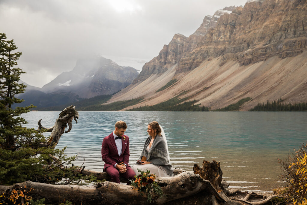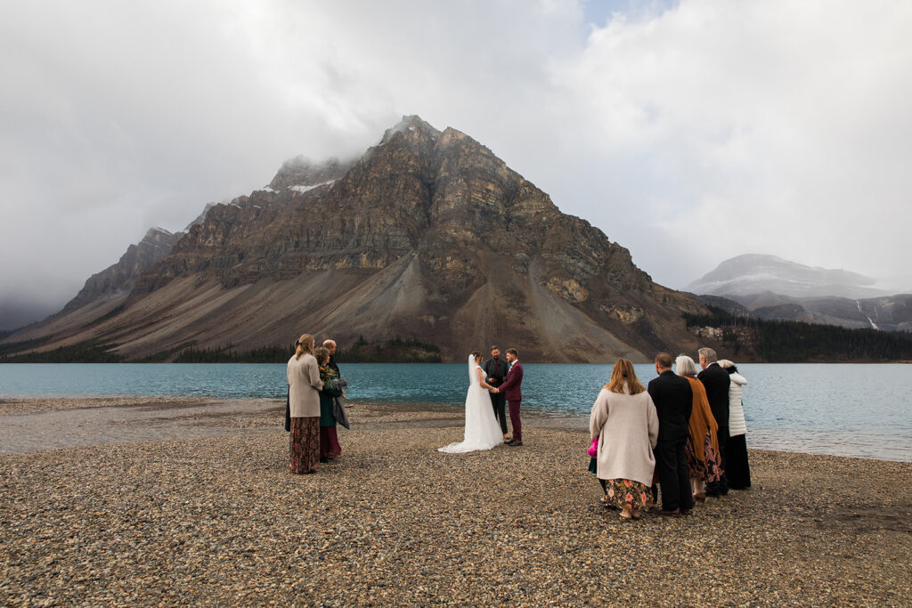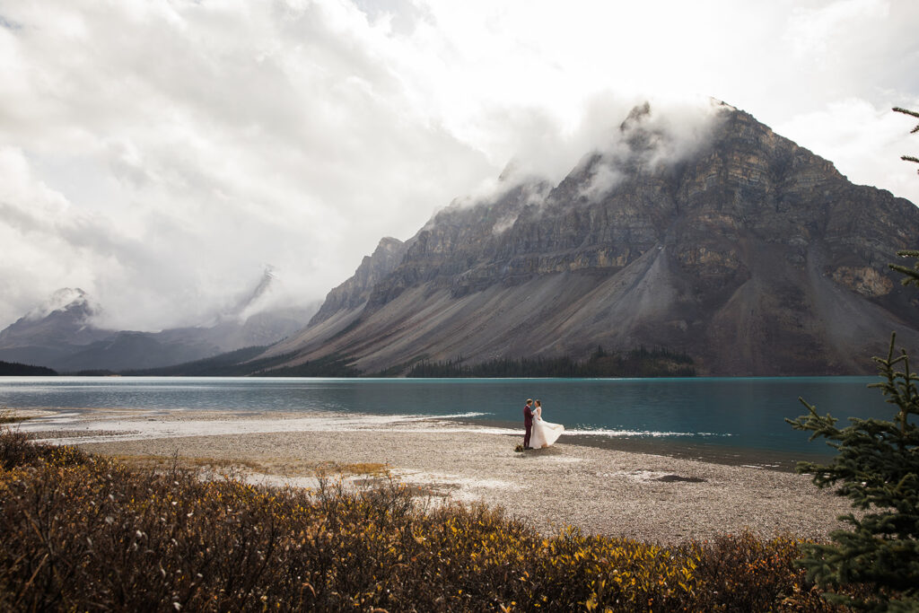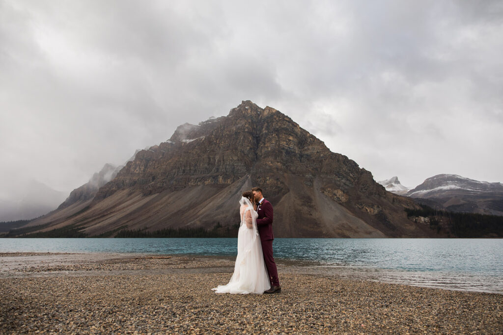 From a quiet ceremony at Bow Lake to celebrating with family later that evening, it was one of those days that felt relaxed, meaningful, and completely true to who they are. Luckily Taylor and Tom were down to earth and just went with whatever the weather was giving us. I always say, the worse the weather, the better the photos! And honestly, the constantly changing mountain weather just made it even more memorable. To see another elopement with crazy weather, check out this Peyto Lake elopement where is snowed despite being fully sunny!