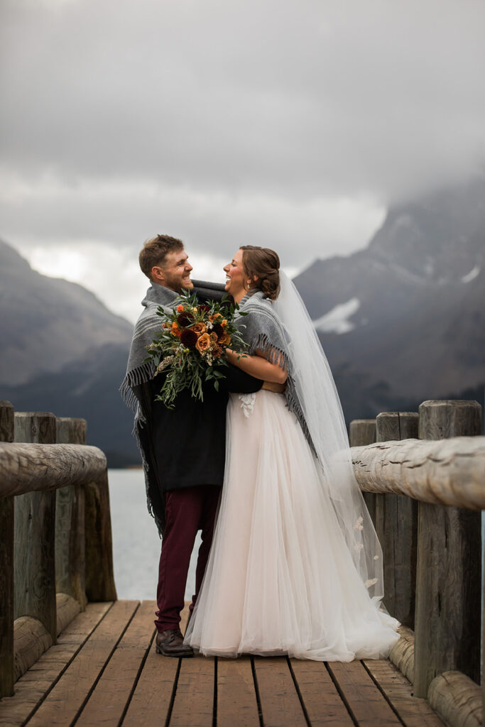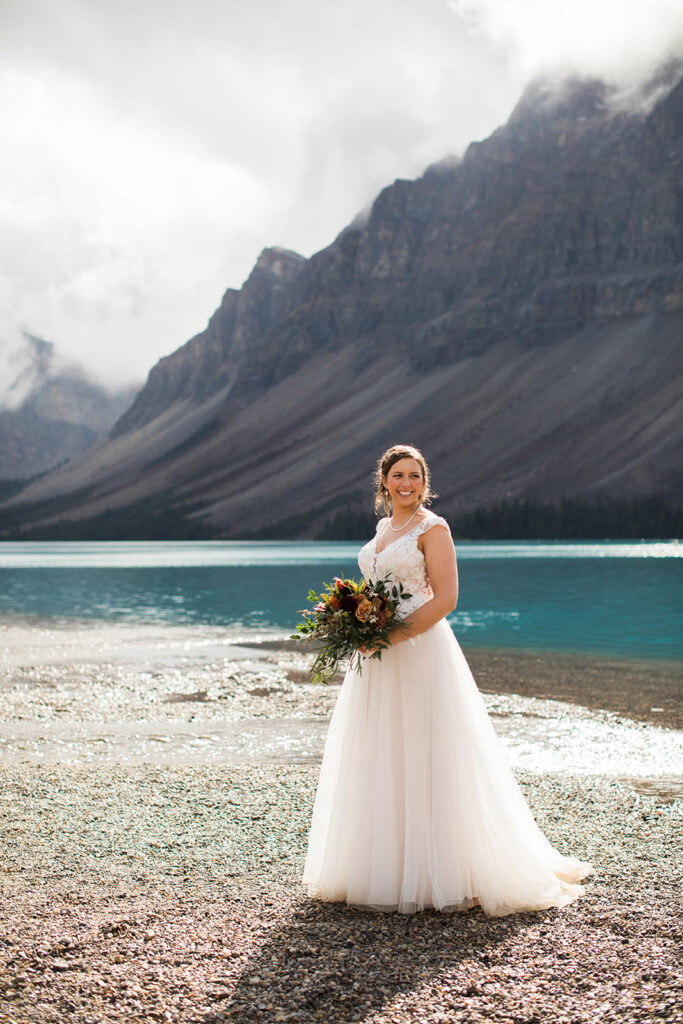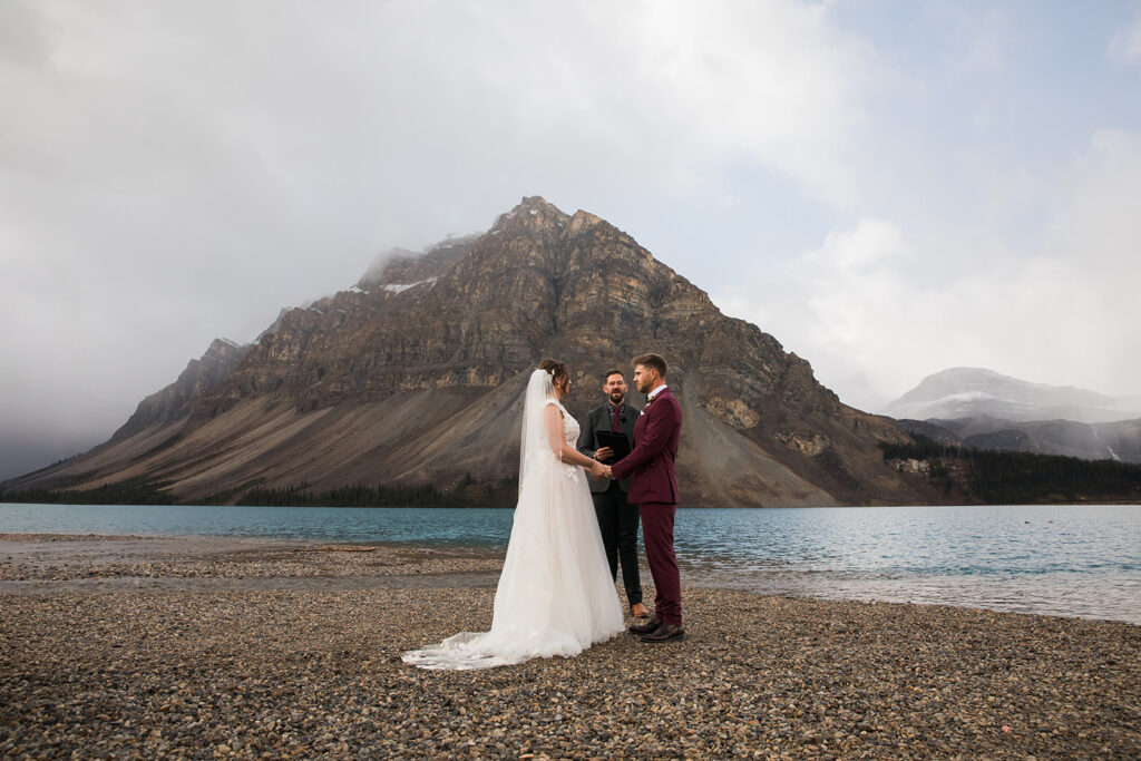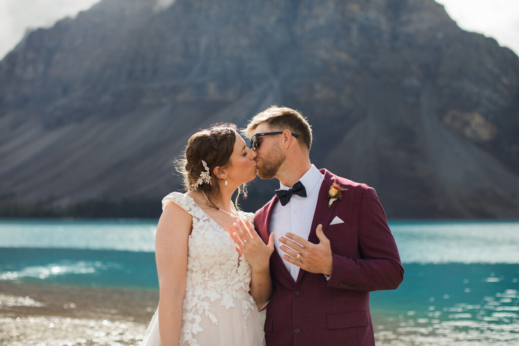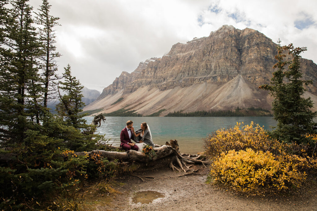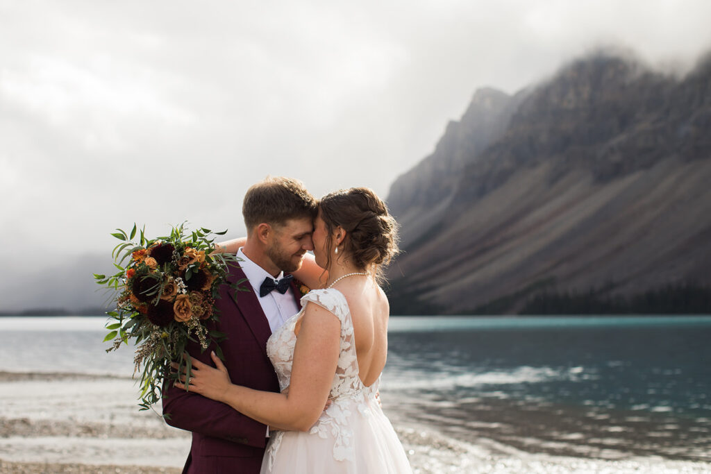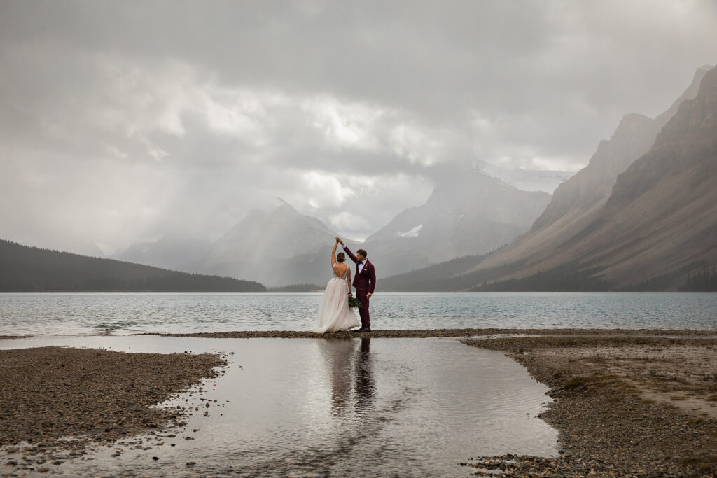 From a quiet ceremony at Bow Lake to celebrating with family later that evening, it was one of those days that felt relaxed, meaningful, and completely true to who they are. Luckily Taylor and Tom were down to earth and just went with whatever the weather was giving us. I always say, the worse the weather, the better the photos! And honestly, the constantly changing mountain weather just made it even more memorable. To see another elopement with crazy weather, check out this Peyto Lake elopement where is snowed despite being fully sunny!