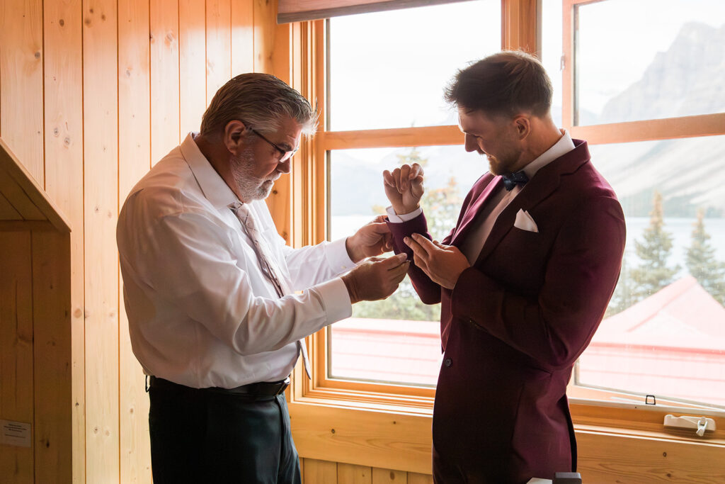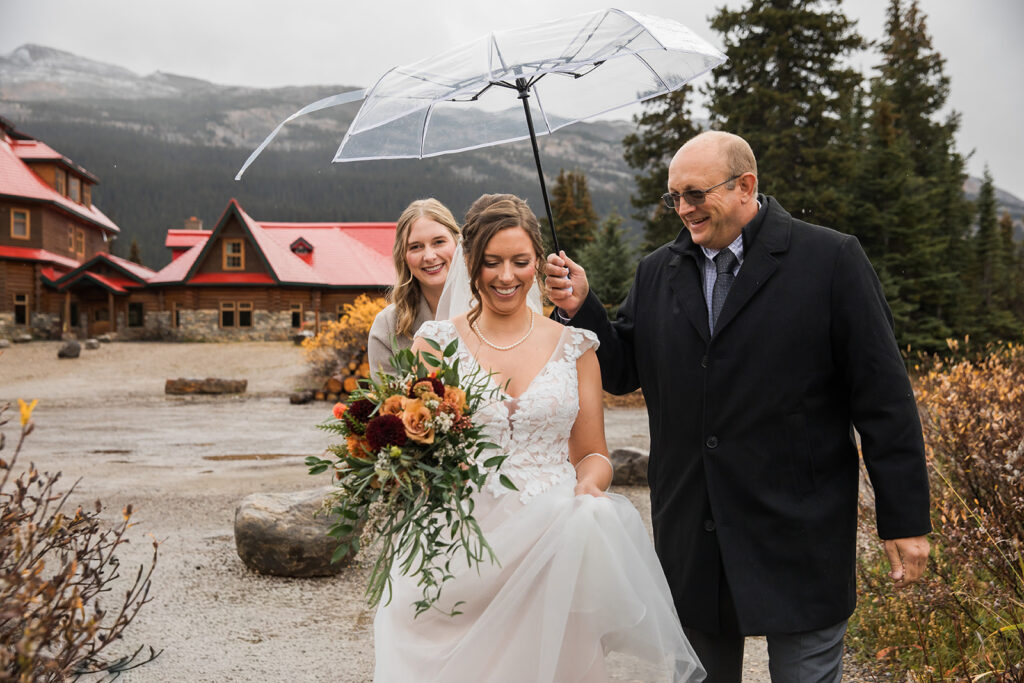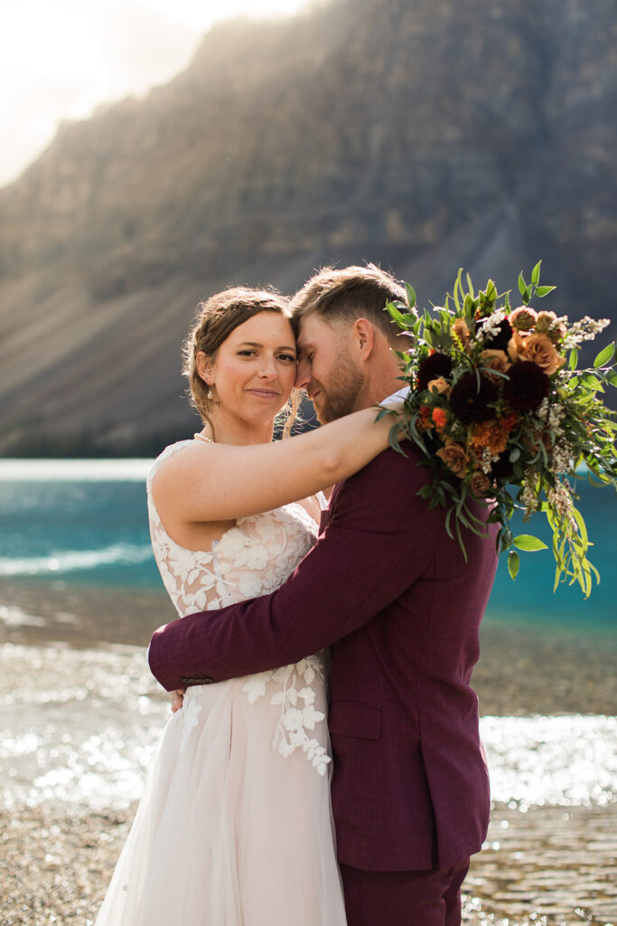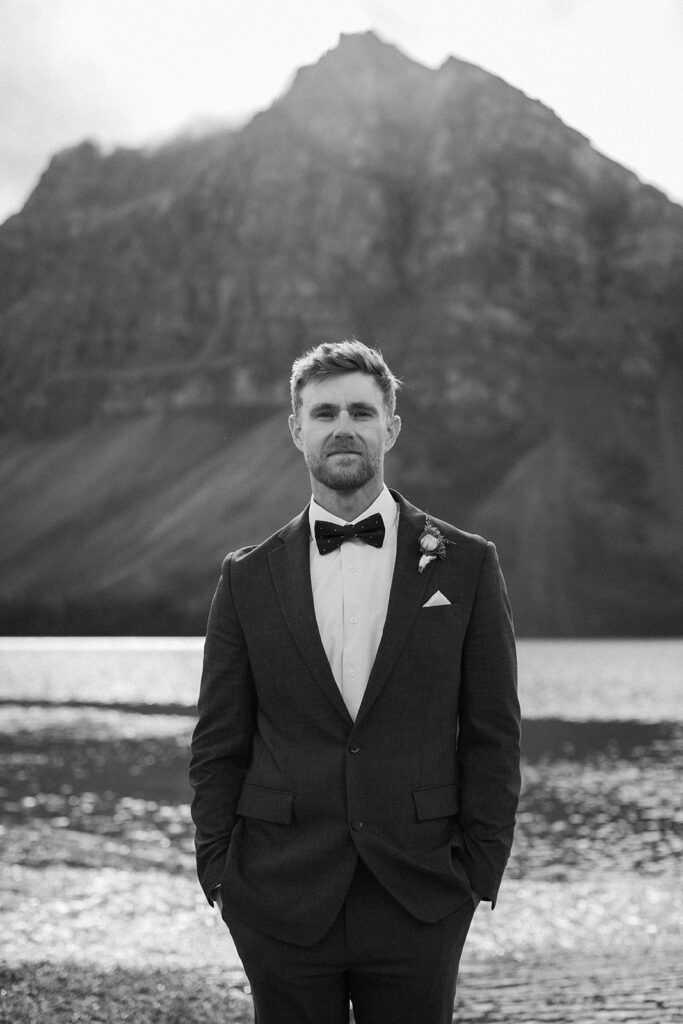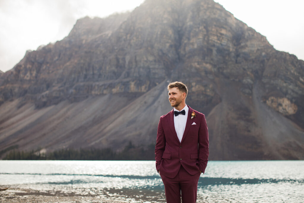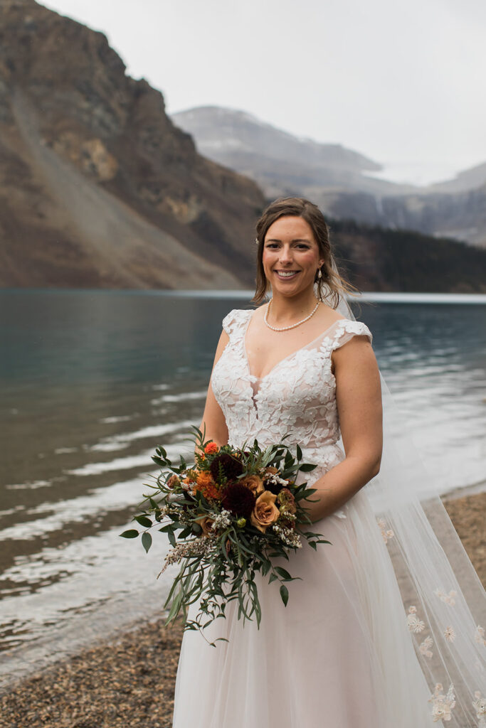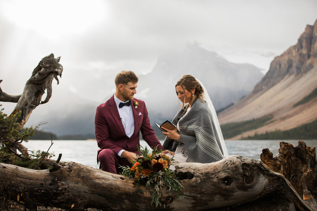 From a quiet ceremony at Bow Lake to celebrating with family later that evening, it was one of those days that felt relaxed, meaningful, and completely true to who they are. Luckily Taylor and Tom were down to earth and just went with whatever the weather was giving us. I always say, the worse the weather, the better the photos! And honestly, the constantly changing mountain weather just made it even more memorable. To see another elopement with crazy weather, check out this Peyto Lake elopement where is snowed despite being fully sunny!