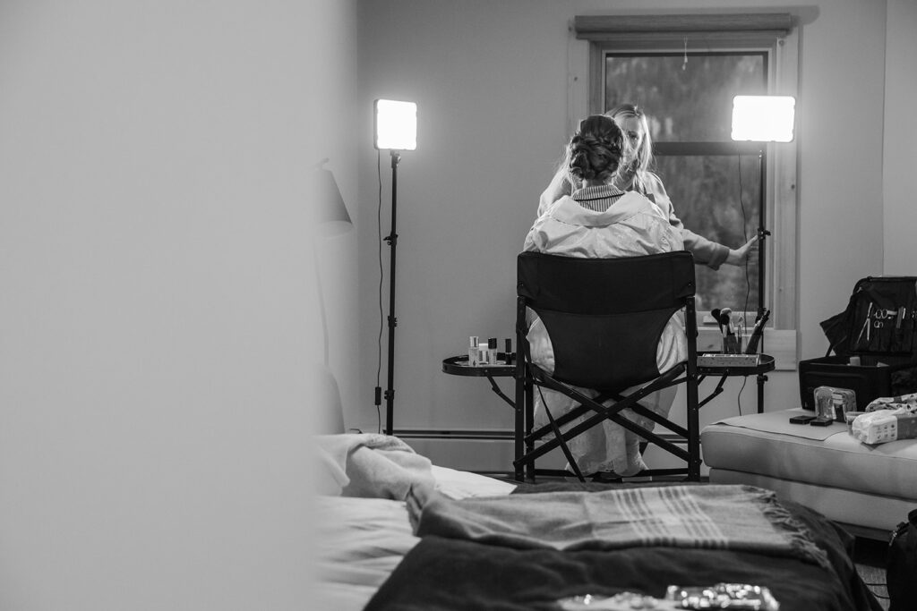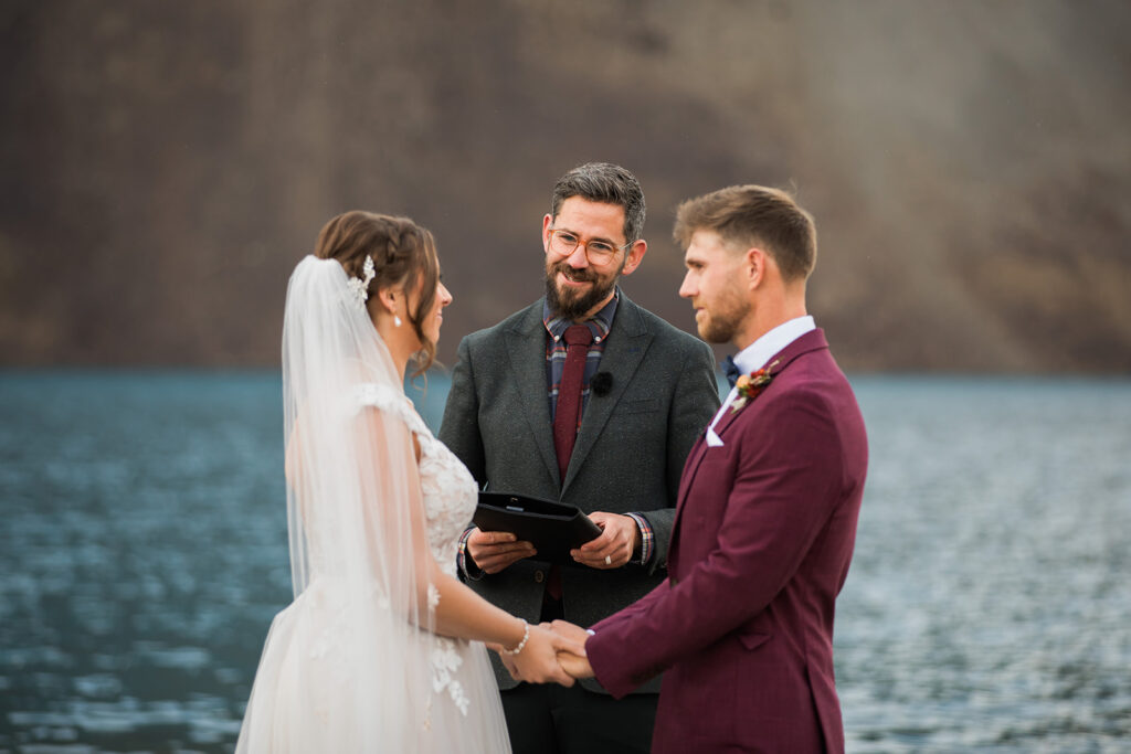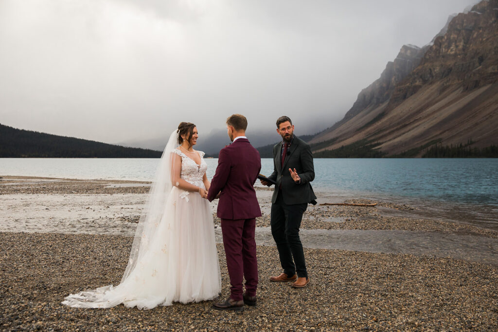Back to the wedding day. The morning started out sunny and beautiful at Bow Lake. Calm water, soft light, and those huge mountains towering over everything. Then, right before their ceremony… a storm rolled in. Dark clouds came over the lake and it started looking like the weather might completely shut things down. Instead of rushing anything, we just waited it out for a bit—and thankfully the mountains cooperated. The storm cleared just enough for Tom and Taylor to have their ceremony and share their private vows by the lake.